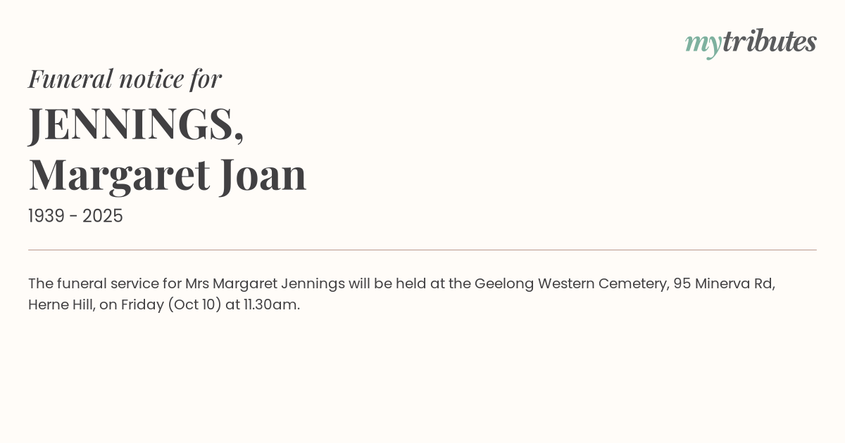 16°CThe funeral service for Mrs Margaret Jennings will be held at the Geelong Western Cemetery, 95 Minerva Rd, Herne Hill, on Friday (Oct 10) at 11.30am.