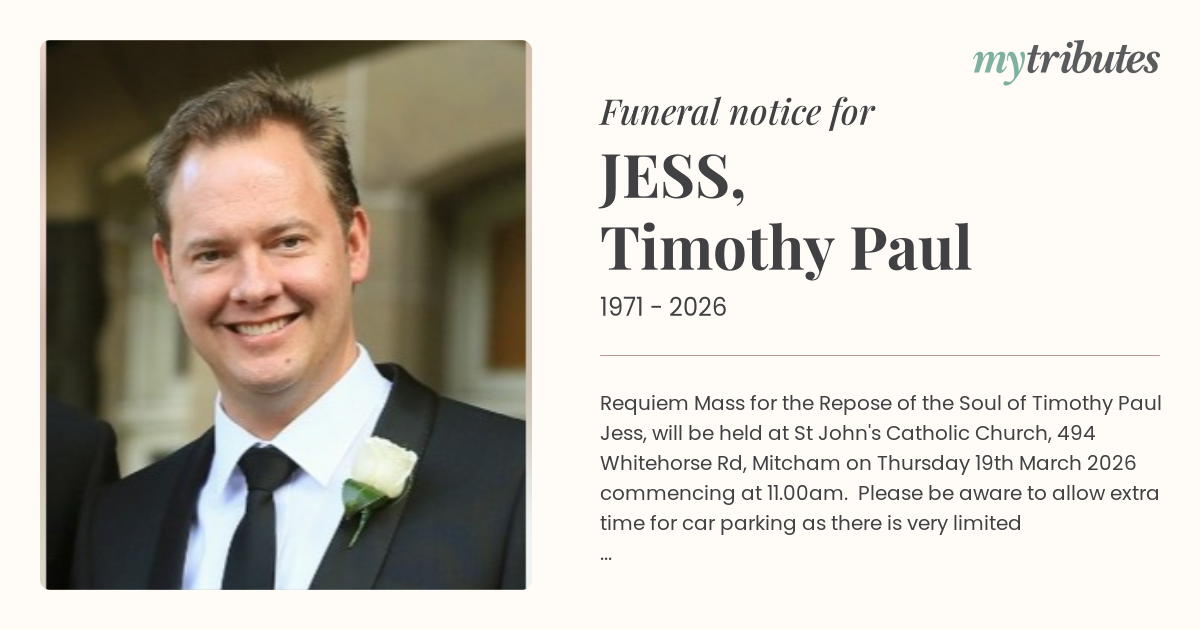 16°CRequiem Mass for the Repose of the Soul of Timothy Paul Jess, will be held at St John's Catholic Church, 494 Whitehorse Rd, Mitcham on Thursday 19th March 2026 commencing at 11.00am. Please be aware to allow extra time for car parking as there is very limited availability near the church.