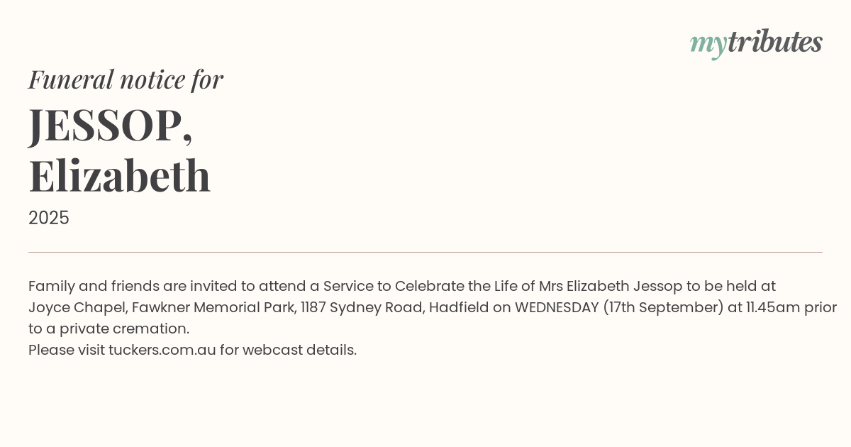 16°CFamily and friends are invited to attend a Service to Celebrate the Life of Mrs Elizabeth Jessop to be held at Joyce Chapel, Fawkner Memorial Park, 1187 Sydney Road, Hadfield on WEDNESDAY (17th September) at 11.45am prior to a private cremation.