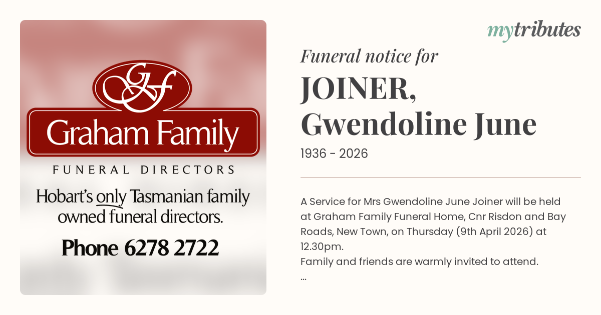 16°CA Service for Mrs Gwendoline June Joiner will be held at Graham Family Funeral Home, Cnr Risdon and Bay Roads, New Town, on Thursday (9th April 2026) at 12.30pm.