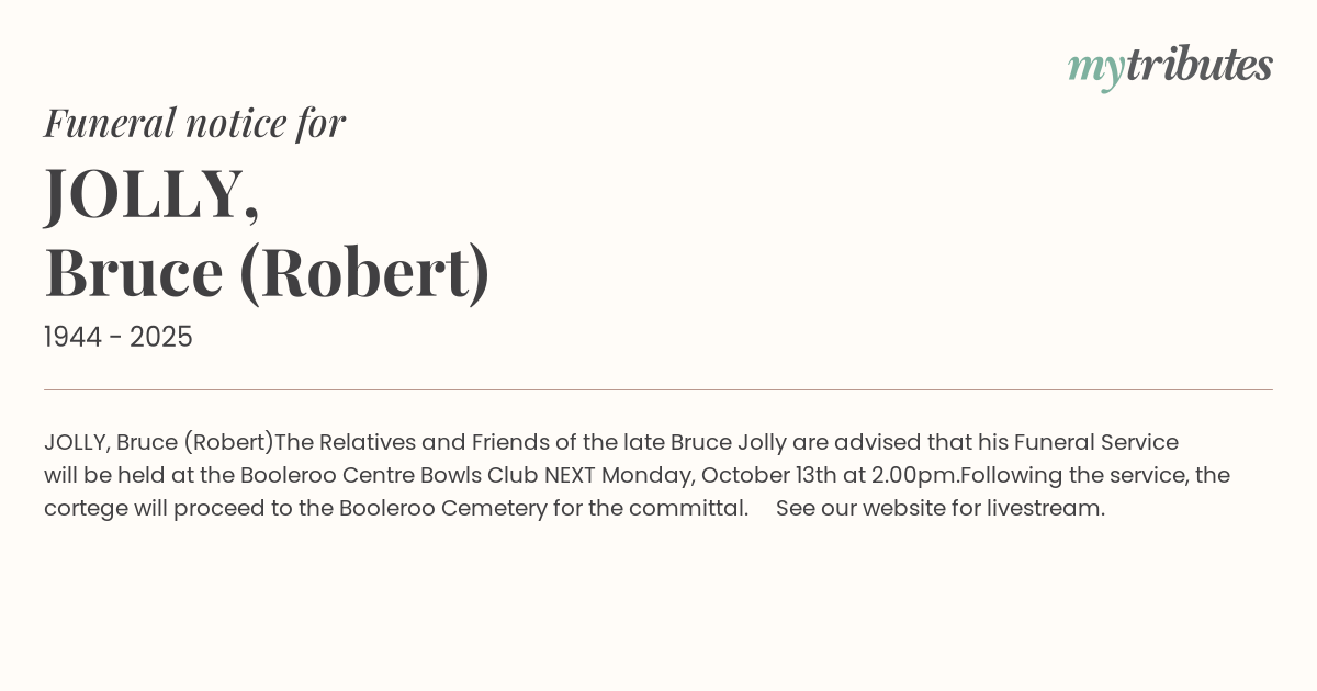 The Relatives and Friends of the late Bruce Jolly are advised that his Funeral Service will be held at the Booleroo Centre Bowls Club NEXT Monday, October 13th at 2.00pm.