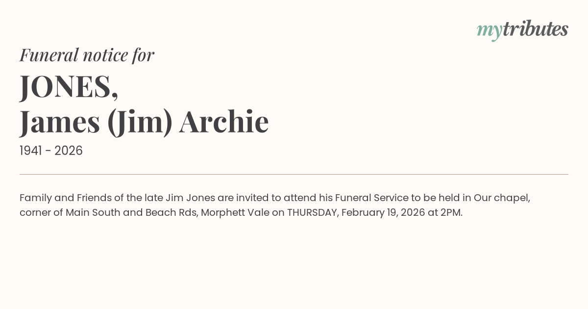 16°CFamily and Friends of the late Jim Jones are invited to attend his Funeral Service to be held in Our chapel, corner of Main South and Beach Rds, Morphett Vale on THURSDAY, February 19, 2026 at 2PM.
