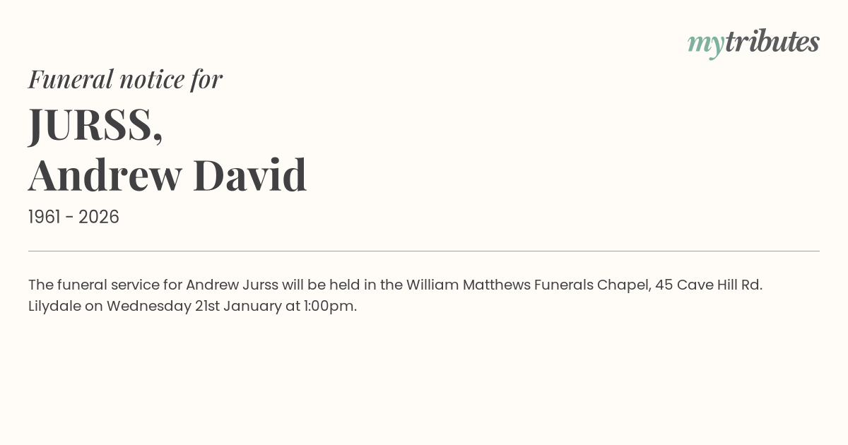 16°CThe funeral service for Andrew Jurss will be held in the William Matthews Funerals Chapel, 45 Cave Hill Rd. Lilydale on Wednesday 21st January at 1:00pm.