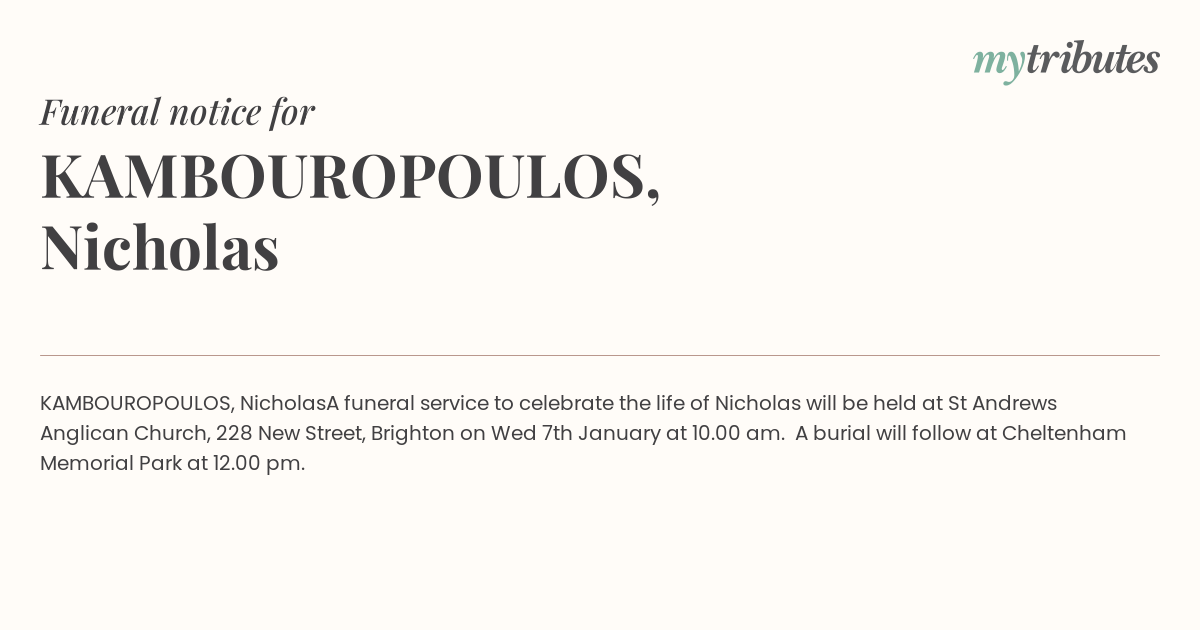A funeral service to celebrate the life of Nicholas will be held at St Andrews Anglican Church, 228 New Street, Brighton on Wed 7th January at 10.00 am.