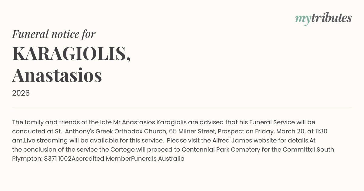 16°CThe family and friends of the late Mr Anastasios Karagiolis are advised that his Funeral Service will be conducted at St. Anthony's Greek Orthodox Church, 65 Milner Street, Prospect on Friday, March 20, at 11:30 am.