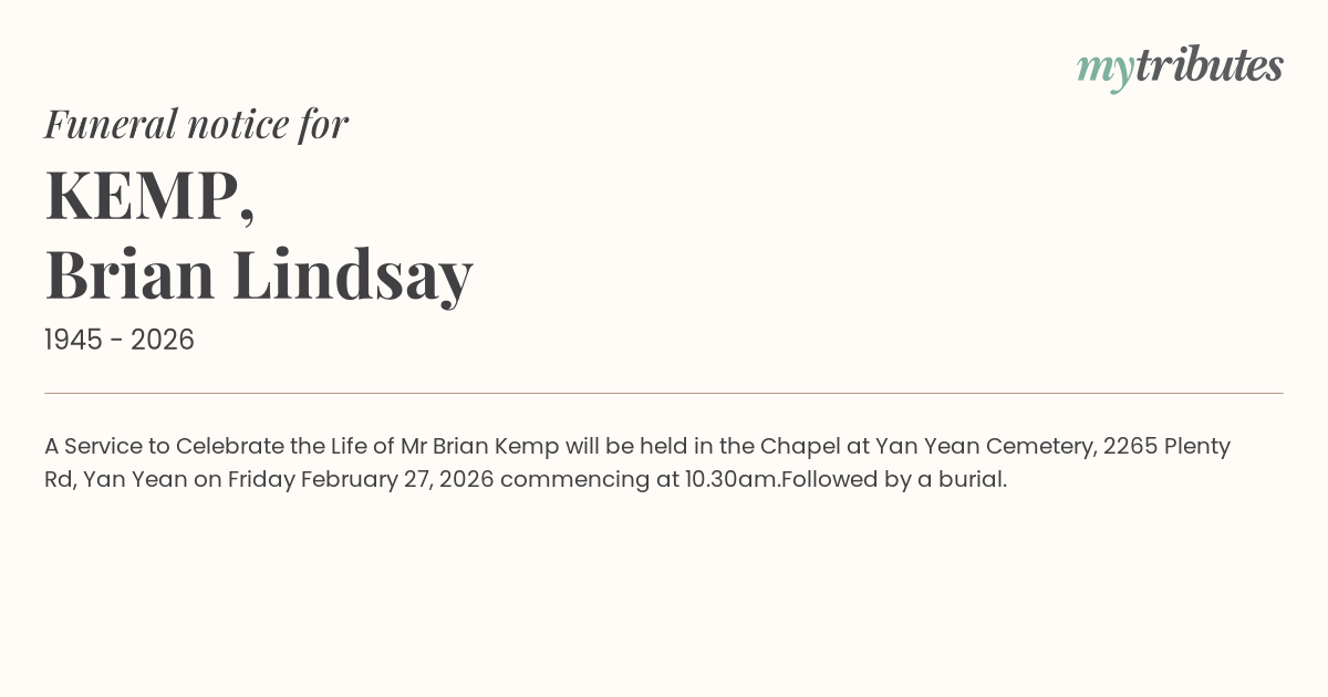 16°CA Service to Celebrate the Life of Mr Brian Kemp will be held in the Chapel at Yan Yean Cemetery, 2265 Plenty Rd, Yan Yean on Friday February 27, 2026 commencing at 10.30am.
