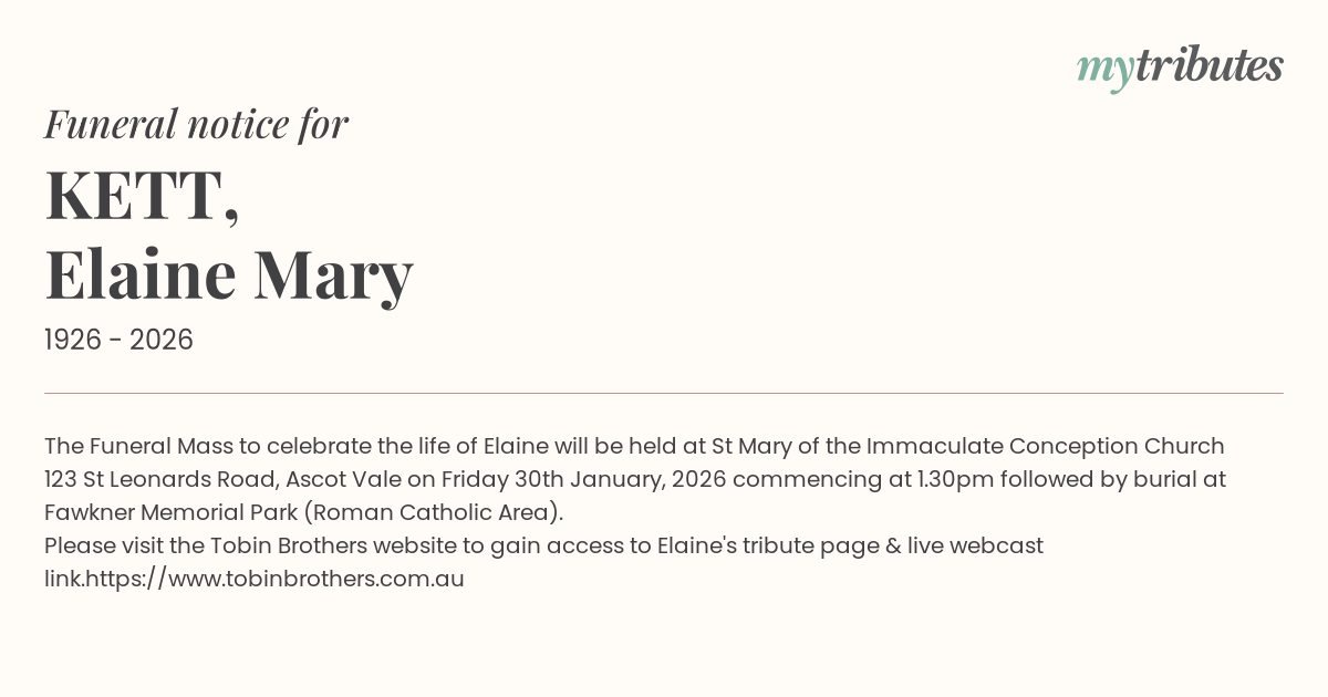 16°CThe Funeral Mass to celebrate the life of Elaine will be held at St Mary of the Immaculate Conception Church – 123 St Leonards Road, Ascot Vale on Friday 30th January, 2026 commencing at 1.30pm followed by burial at Fawkner Memorial Park (Roman Catholic Area).