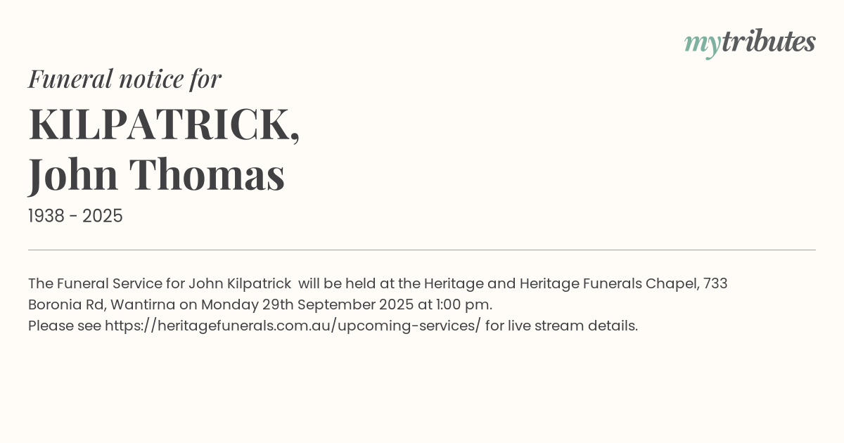 16°CThe Funeral Service for John Kilpatrick will be held at the Heritage and Heritage Funerals Chapel, 733 Boronia Rd, Wantirna on Monday 29th September 2025 at 1:00 pm.