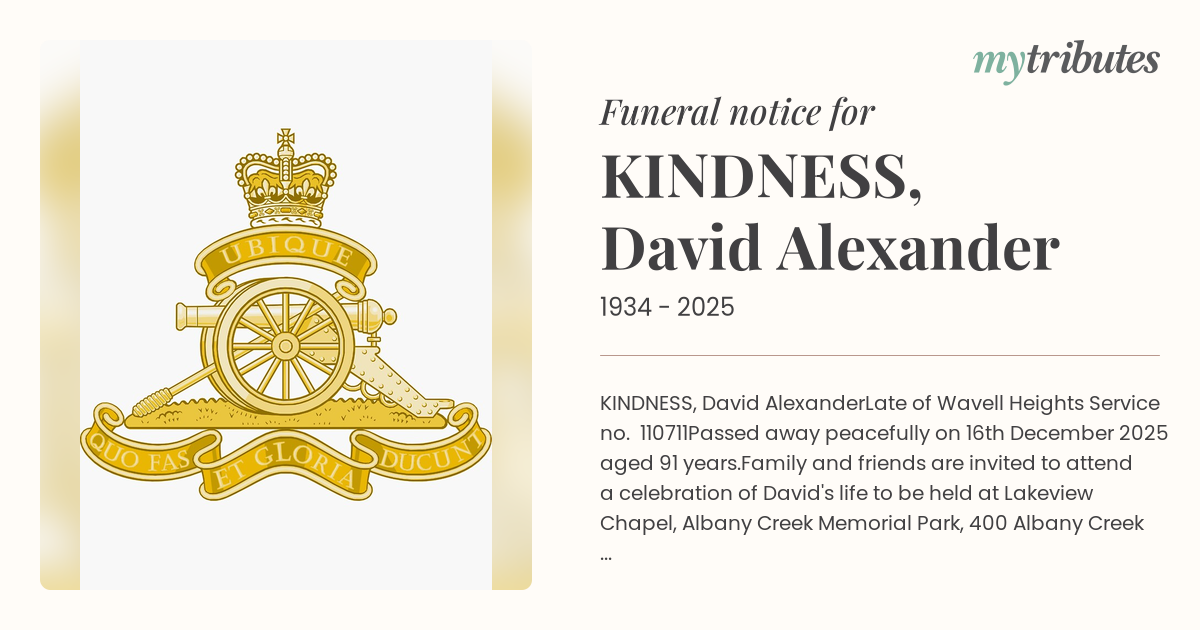Family and friends are invited to attend a celebration of David's life to be held at Lakeview Chapel, Albany Creek Memorial Park, 400 Albany Creek Road, Bridgeman Downs on Monday 22nd December 2025 at 3.30pm