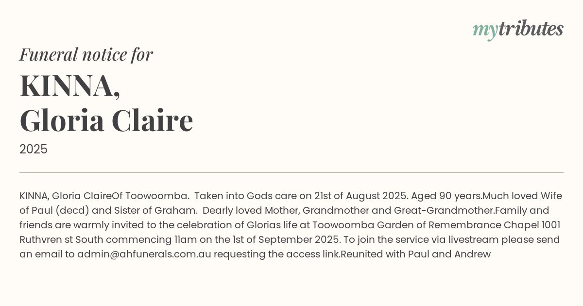 Family and friends are warmly invited to the celebration of Gloria’s life at Toowoomba Garden of Remembrance Chapel 1001 Ruthvren st South commencing 11am on the 1st of September 2025. To join the service via livestream please send an email to admin@ahfunerals.com.au requesting the access link.