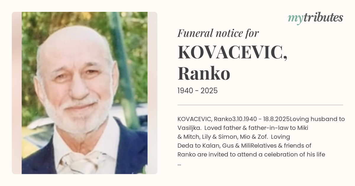 Relatives & friends of Ranko are invited to attend a celebration of his life to be held at St Sava Serbian Orthodox church, Dalwood Cres Malak on Thursday 28 August @ 12pm with his interment to follow at the Thorak cemetery.