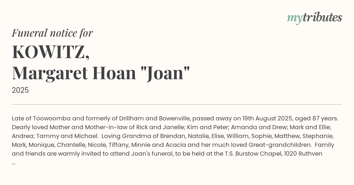 Family and friends are warmly invited to attend Joan's funeral, to be held at the T.S. Burstow Chapel, 1020 Ruthven Street (south), Toowoomba, service commencing at 12.00pm, Thursday, 4th September 2025 followed by interment at the Garden of Remembrance.