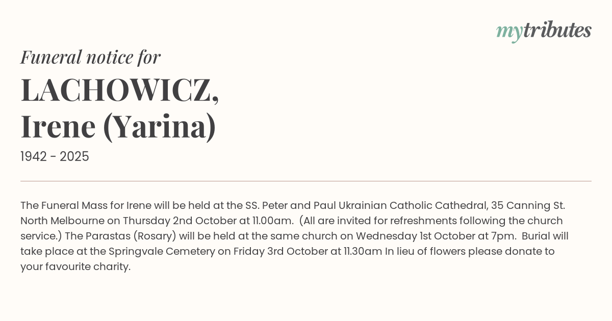 16°CThe Funeral Mass for Irene will be held at the SS. Peter and Paul Ukrainian Catholic Cathedral, 35 Canning St. North Melbourne on Thursday 2nd October at 11.00am. (All are invited for refreshments following the church service.)