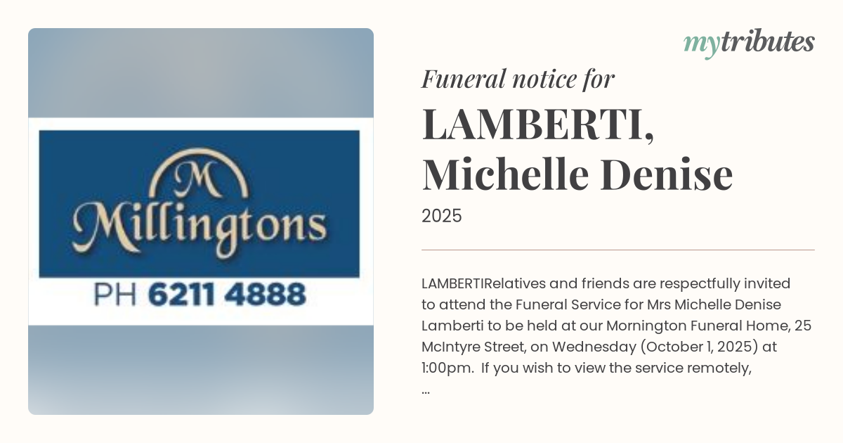 Relatives and friends are respectfully invited to attend the Funeral Service for Mrs Michelle Denise Lamberti to be held at our Mornington Funeral Home, 25 McIntyre Street, on Wednesday (October 1, 2025) at 1:00pm. If you wish to view the service remotely, please go to millingtons.com.au/