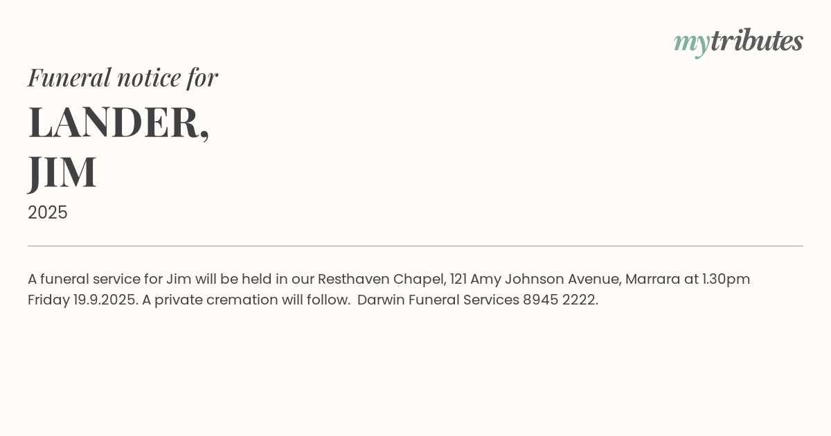 16°CA funeral service for Jim will be held in our Resthaven Chapel, 121 Amy Johnson Avenue, Marrara at 1.30pm Friday 19.9.2025. A private cremation will follow. Darwin Funeral Services 8945... .