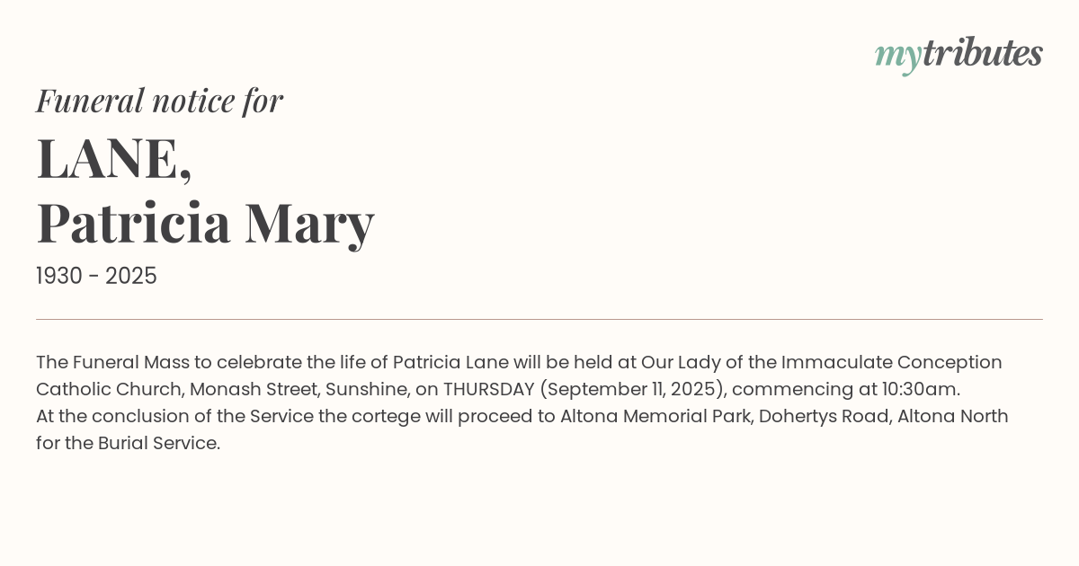 16°CThe Funeral Mass to celebrate the life of Patricia Lane will be held at Our Lady of the Immaculate Conception Catholic Church, Monash Street, Sunshine, on THURSDAY (September 11, 2025), commencing at 10:30am.