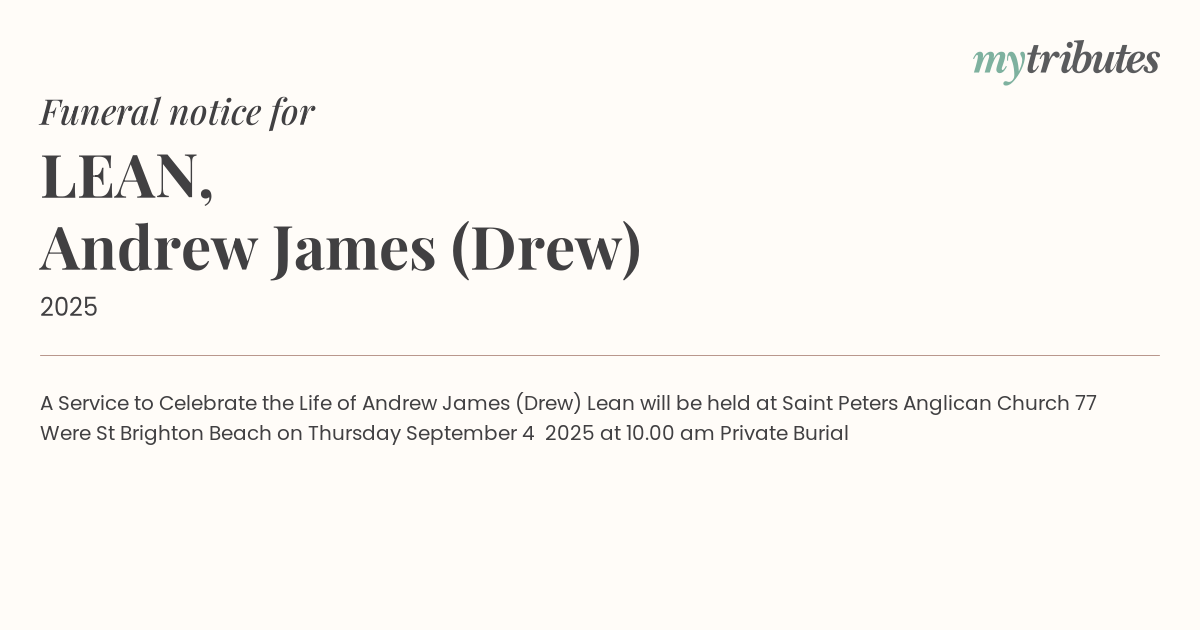 16°CA Service to Celebrate the Life of Andrew James (Drew) Lean will be held at Saint Peters Anglican Church 77 Were St Brighton Beach on Thursday September 4 2025 at 10.00 am Private Burial
