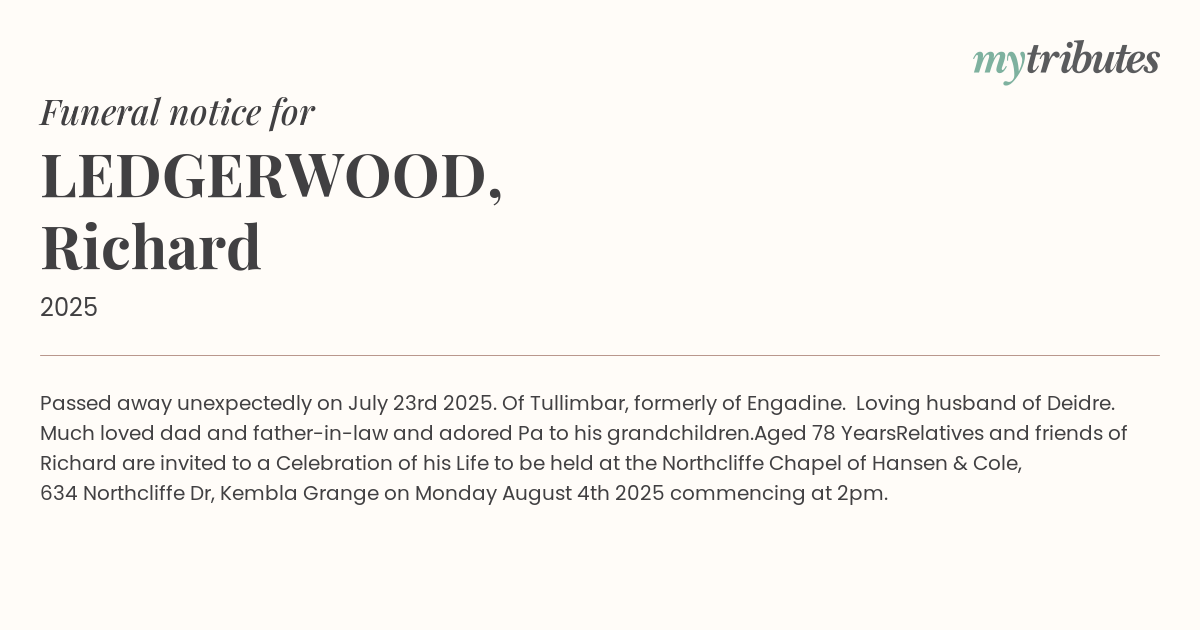 Relatives and friends of Richard are invited to a Celebration of his Life to be held at the Northcliffe Chapel of Hansen & Cole, 634 Northcliffe Dr, Kembla Grange on Monday August 4th 2025 commencing at 2pm.