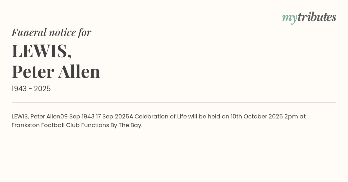 A Celebration of Life will be held on 10th October 2025 2pm at Frankston Football Club Functions By The Bay.