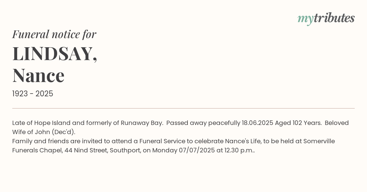 Family and friends are invited to attend a Funeral Service to celebrate Nance's Life, to be held at Somerville Funerals Chapel, 44 Nind Street, Southport, on Monday 07/07/2025 at 12.30 p.m..