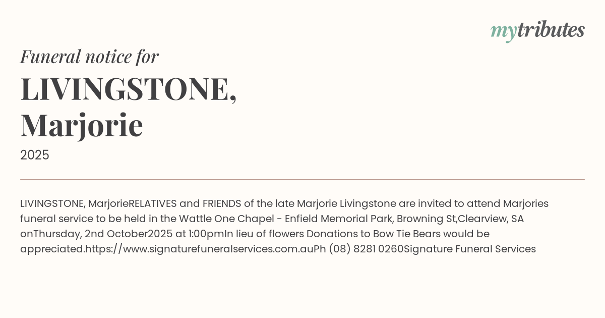 RELATIVES and FRIENDS of the late Marjorie Livingstone are invited to attend Marjorie’s funeral service to be held in the Wattle One Chapel - Enfield Memorial Park, Browning St,
