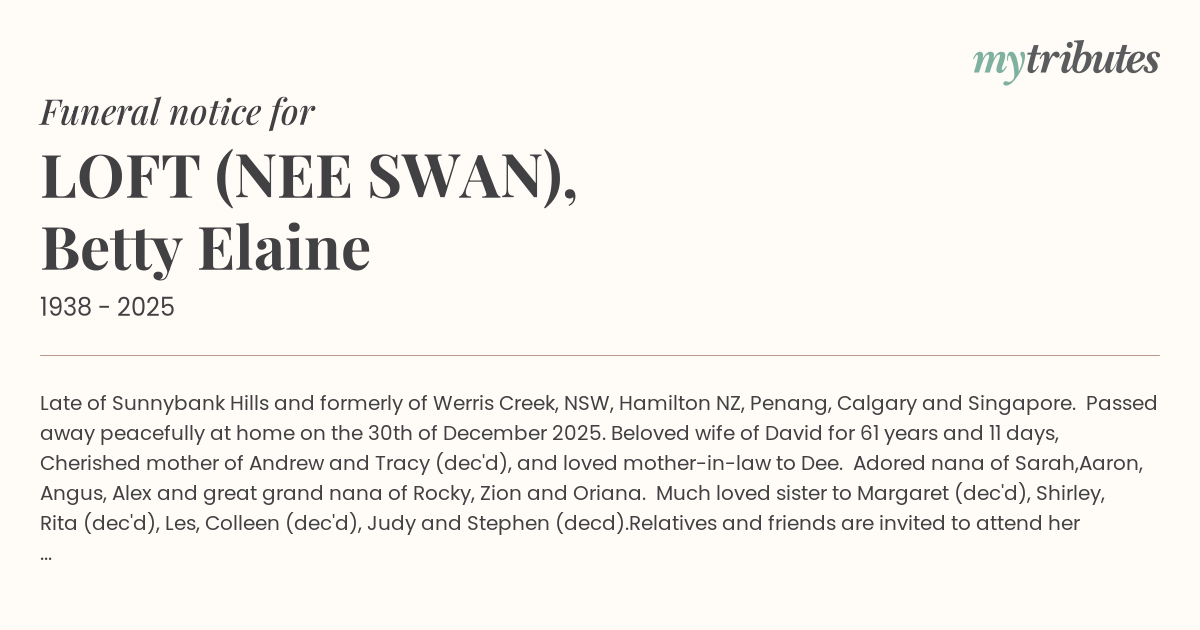 16°CLate of Sunnybank Hills and formerly of Werris Creek, NSW, Hamilton NZ, Penang, Calgary and Singapore. Passed away peacefully at home on the 30th of December 2025. Beloved wife of David for 61 years and 11 days, Cherished mother of Andrew and Tracy (dec'd), and loved mother-in-law to Dee. Adored nana of Sarah,Aaron, Angus, Alex and great grand nana of Rocky, Zion and Oriana. Much loved sister to Margaret (dec'd), Shirley, Rita (dec'd), Les, Colleen (dec'd), Judy and Stephen (dec’d).