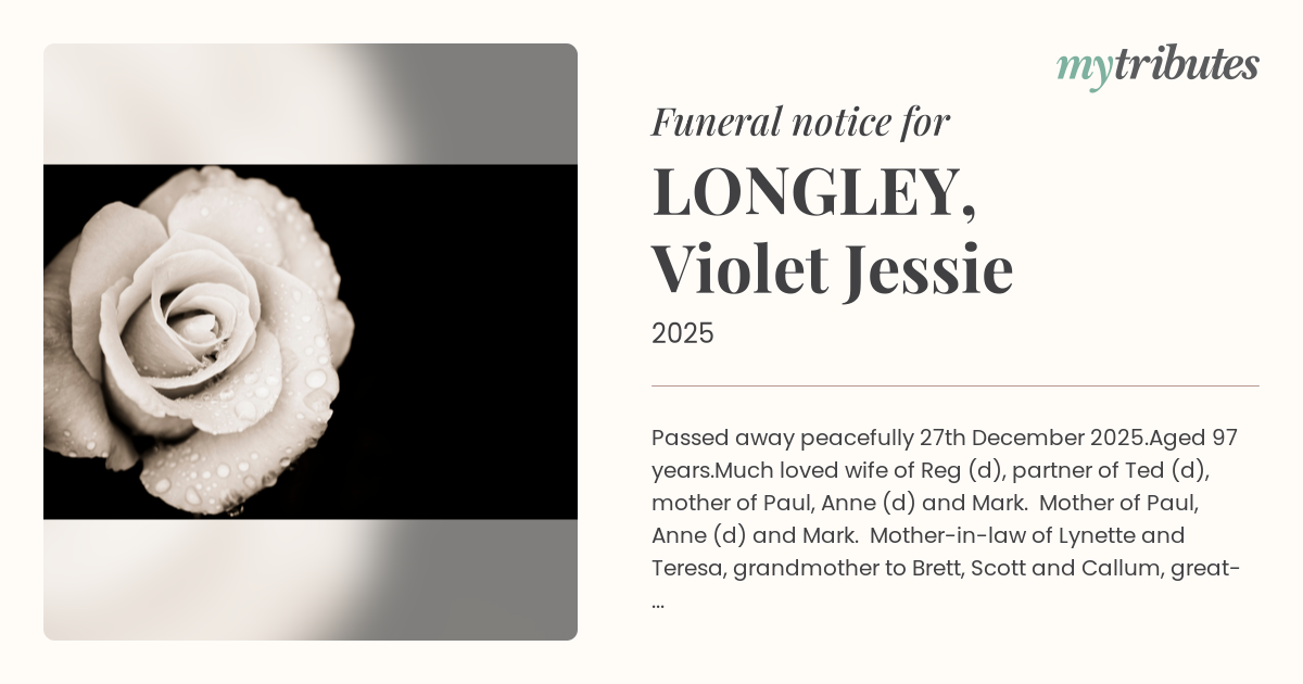A celebration of Violet's life will be held at Albany Creek Memorial Park, Garden Chapel, 400 Albany Creek Road, Bridgeman Downs, on Friday 9th January, commencing at 12 p.m.