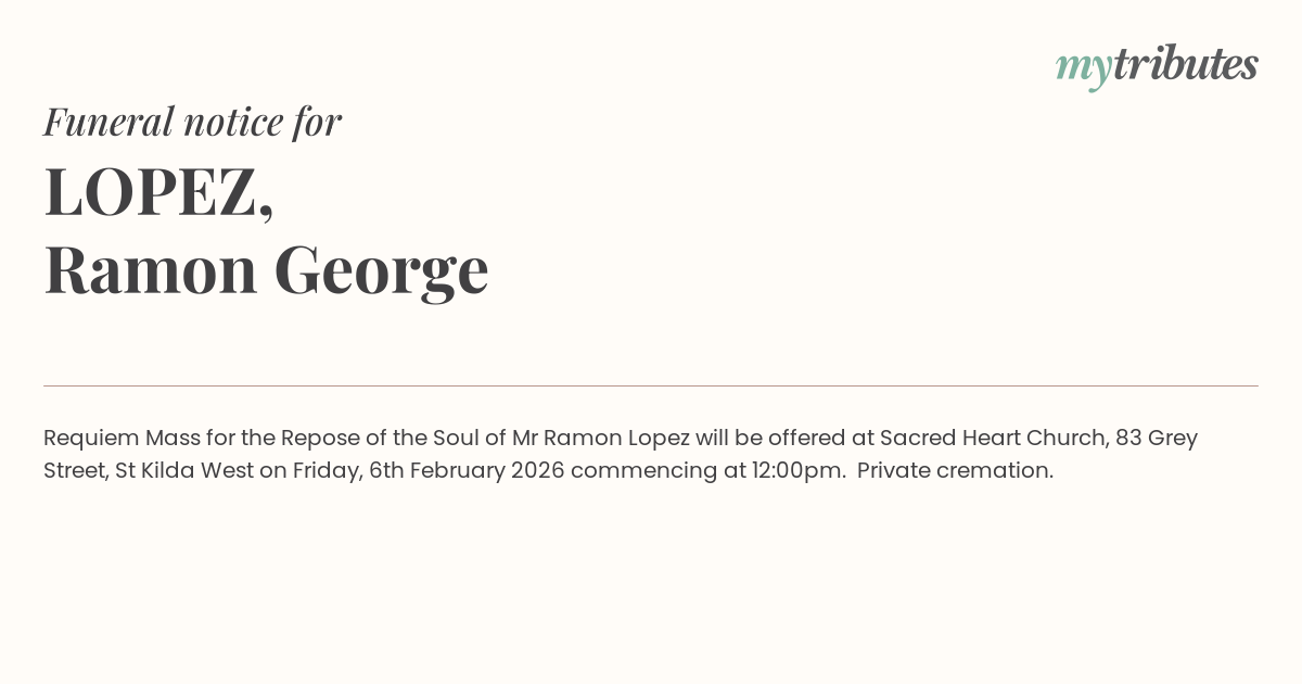 16°CRequiem Mass for the Repose of the Soul of Mr Ramon Lopez will be offered at Sacred Heart Church, 83 Grey Street, St Kilda West on Friday, 6th February 2026 commencing at 12:00pm. Private cremation.