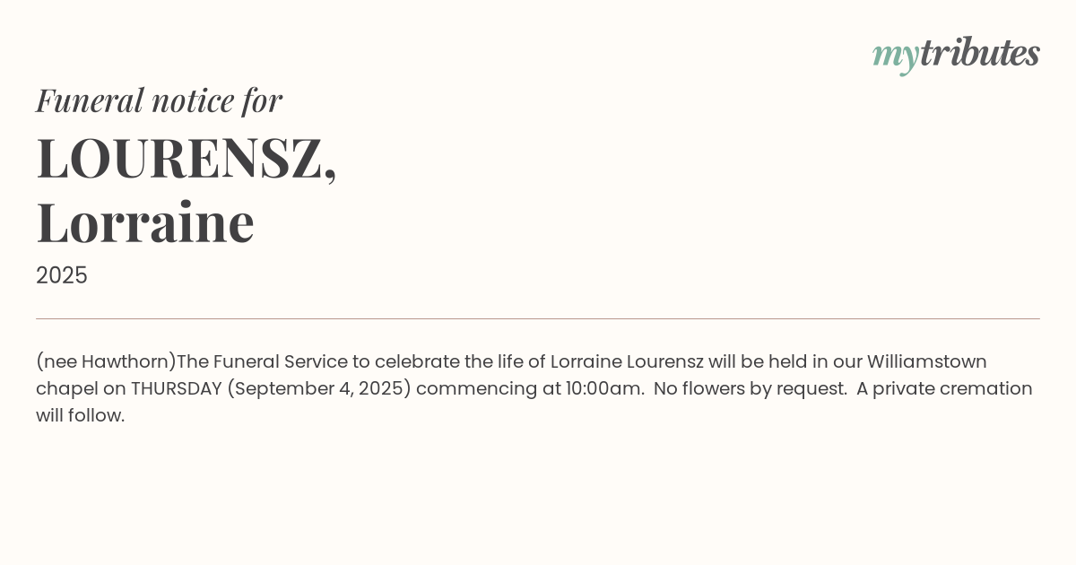 The Funeral Service to celebrate the life of Lorraine Lourensz will be held in our Williamstown chapel on THURSDAY (September 4, 2025) commencing at 10:00am. No flowers by request. A private cremation will follow.