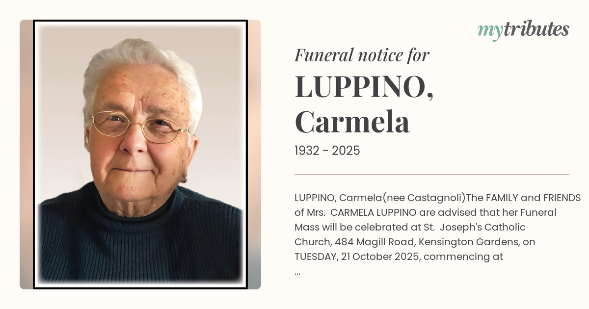 The FAMILY and FRIENDS of Mrs. CARMELA LUPPINO are advised that her Funeral Mass will be celebrated at St. Joseph's Catholic Church, 484 Magill Road, Kensington Gardens, on TUESDAY, 21 October 2025, commencing at 11.00am.