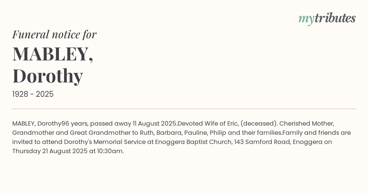 Family and friends are invited to attend Dorothy's Memorial Service at Enoggera Baptist Church, 143 Samford Road, Enoggera on Thursday 21 August 2025 at 10:30am.