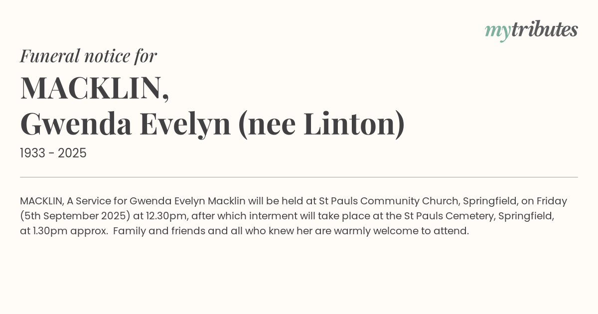 16°CMACKLIN, A Service for Gwenda Evelyn Macklin will be held at St Paul’s Community Church, Springfield, on Friday (5th September 2025) at 12.30pm, after which interment will take place at the St Paul’s Cemetery, Springfield, at 1.30pm approx. Family and friends and all who knew her are warmly welcome to attend.