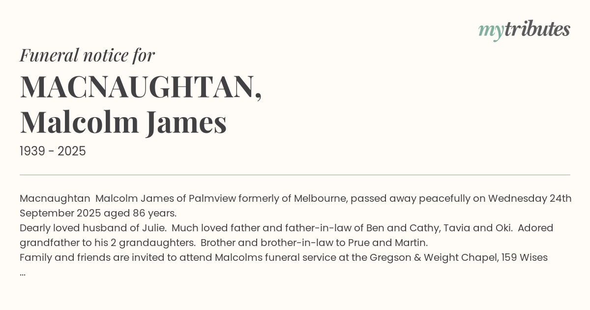 16°CMacnaughtan – Malcolm James of Palmview formerly of Melbourne, passed away peacefully on Wednesday 24th September 2025 aged 86 years.