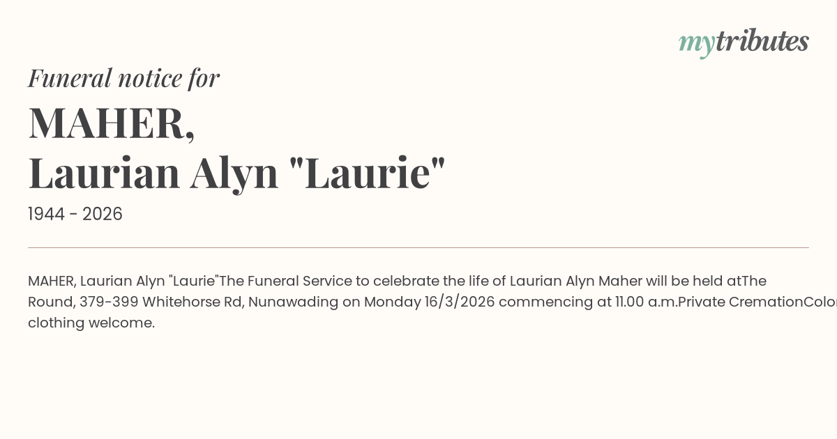 The Funeral Service to celebrate the life of Laurian Alyn Maher will be held at