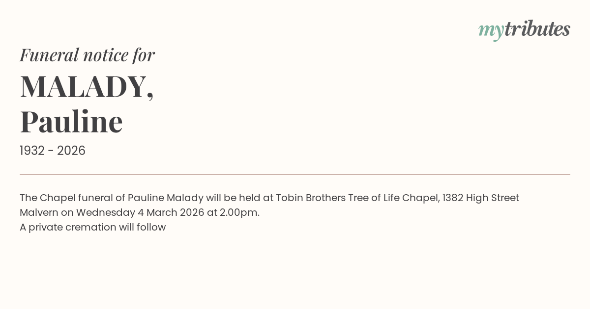 16°CThe Chapel funeral of Pauline Malady will be held at Tobin Brothers Tree of Life Chapel, 1382 High Street Malvern on Wednesday 4 March 2026 at 2.00pm.