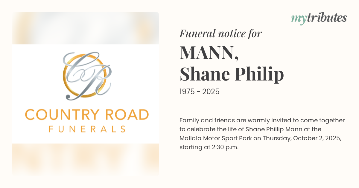 16°CFamily and friends are warmly invited to come together to celebrate the life of Shane Phillip Mann at the Mallala Motor Sport Park on Thursday, October 2, 2025, starting at 2:30 p.m.