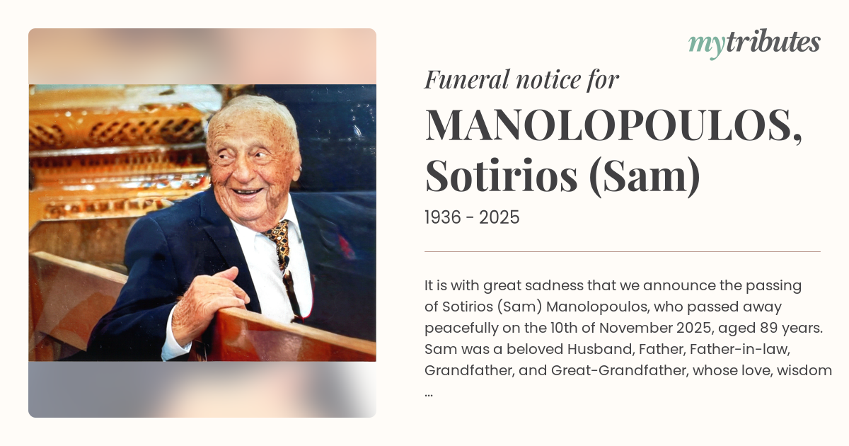 16°CIt is with great sadness that we announce the passing of Sotirios (Sam) Manolopoulos, who passed away peacefully on the 10th of November 2025, aged 89 years. Sam was a beloved Husband, Father, Father-in-law, Grandfather, and Great-Grandfather, whose love, wisdom and generosity touched the lives of all who knew him. His legacy of family, faith, and hard work will be forever cherished and remembered by those who had the privilege of sharing in his life. Family and friends are warmly invited to attend the funeral service for Sotirios (Sam) Manolopoulos, which will be held at the Greek Orthodox Church of the Dormition of Our Lady, 269 Creek Road, Mt Gravatt East, Brisbane on Tuesday, 25 November 2025, at 11.00am. May his memory be eternal.