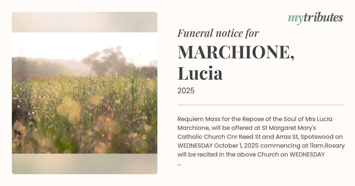 16°CRequiem Mass for the Repose of the Soul of Mrs Lucia Marchione, will be offered at St Margaret Mary's Catholic Church Cnr Reed St and Arras St, Spotswood on WEDNESDAY October 1, 2025 commencing at 11am.