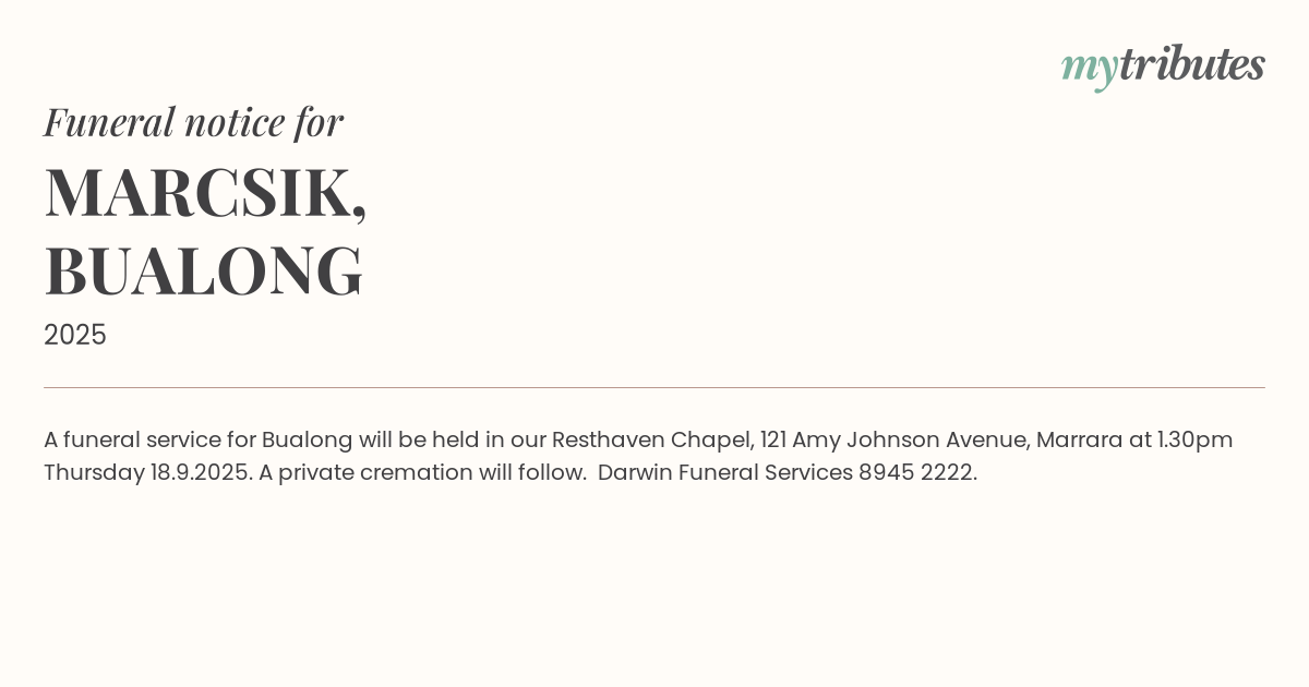 16°CA funeral service for Bualong will be held in our Resthaven Chapel, 121 Amy Johnson Avenue, Marrara at 1.30pm Thursday 18.9.2025. A private cremation will follow. Darwin Funeral Services 8945... .