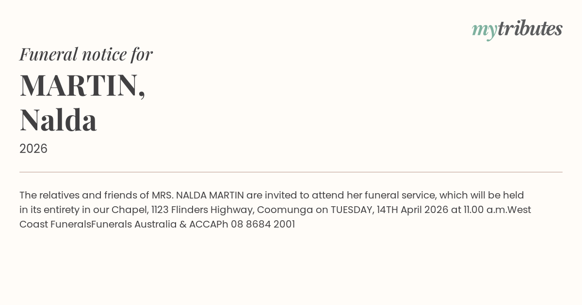 16°CThe relatives and friends of MRS. NALDA MARTIN are invited to attend her funeral service, which will be held in its entirety in our Chapel, 1123 Flinders Highway, Coomunga on TUESDAY, 14TH April 2026 at 11.00 a.m.