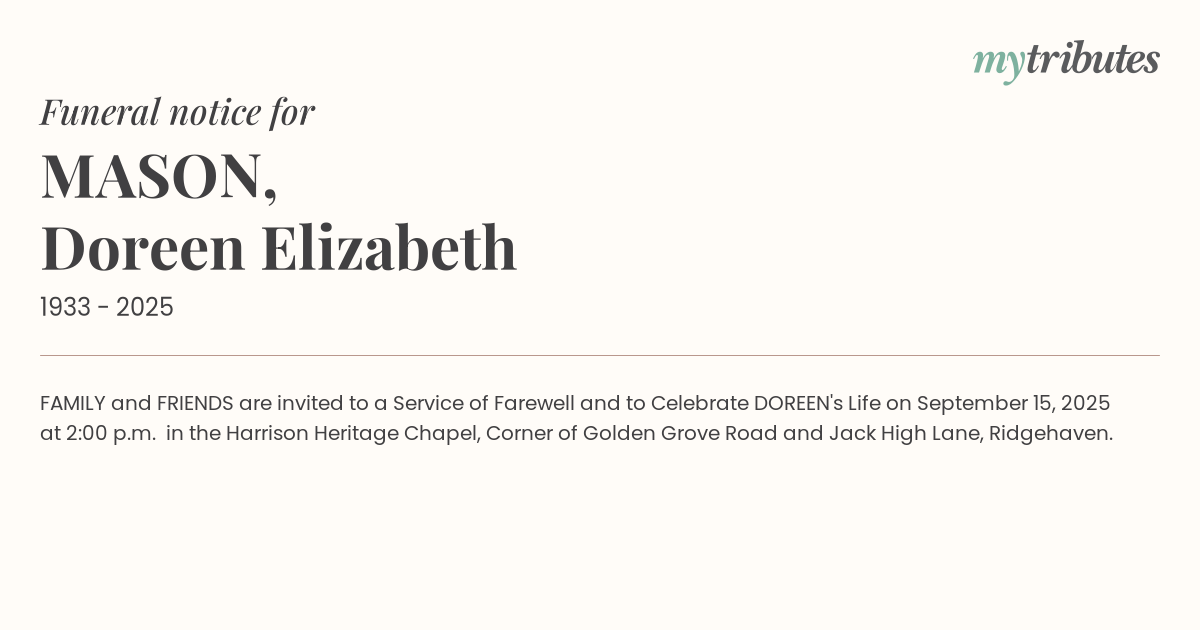 16°CFAMILY and FRIENDS are invited to a Service of Farewell and to Celebrate DOREEN's Life on September 15, 2025 at 2:00 p.m. in the Harrison Heritage Chapel, Corner of Golden Grove Road and Jack High Lane, Ridgehaven.