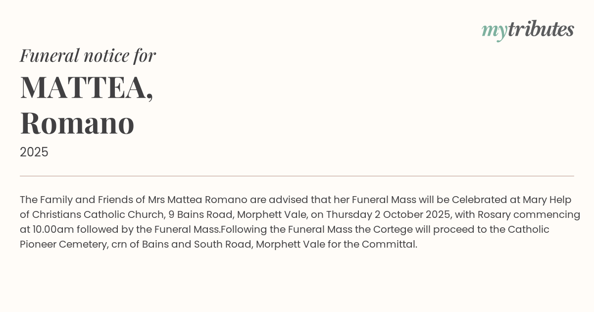 16°CThe Family and Friends of Mrs Mattea Romano are advised that her Funeral Mass will be Celebrated at Mary Help of Christians Catholic Church, 9 Bains Road, Morphett Vale, on Thursday 2 October 2025, with Rosary commencing at 10.00am followed by the Funeral Mass.