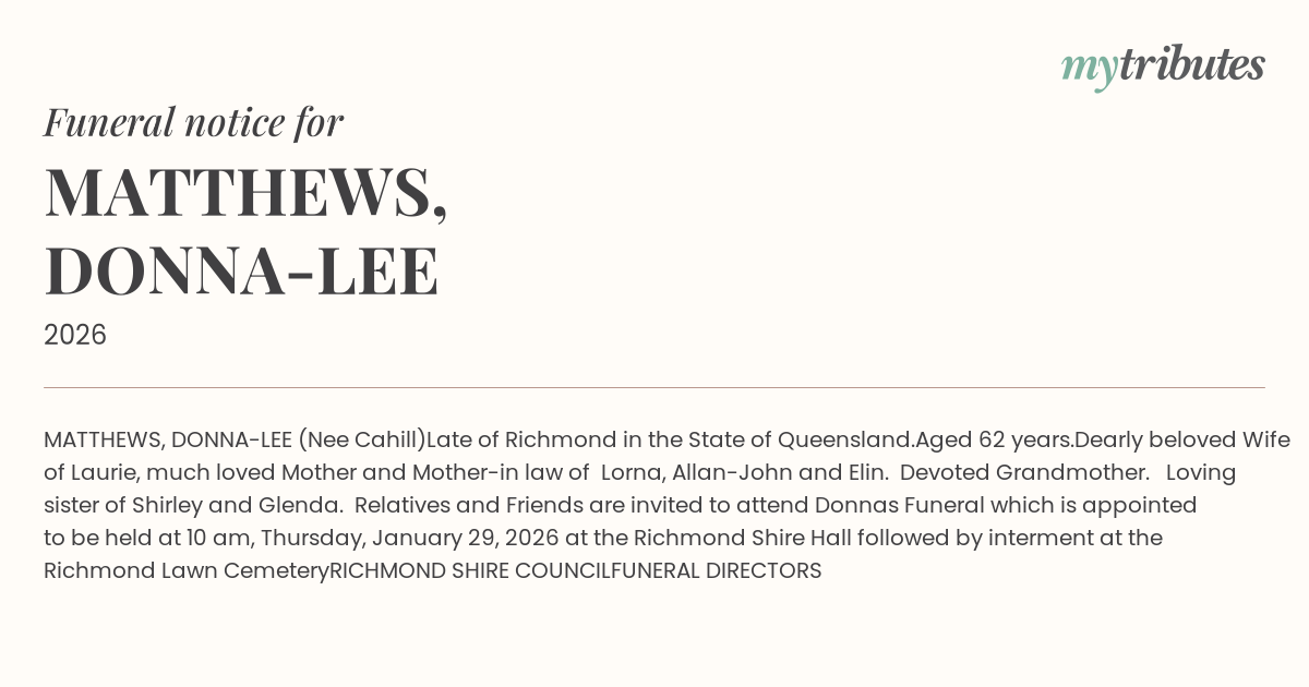 Relatives and Friends are invited to attend Donna’s Funeral which is appointed to be held at 10 am, Thursday, January 29, 2026 at the Richmond Shire Hall followed by interment at the Richmond Lawn Cemetery