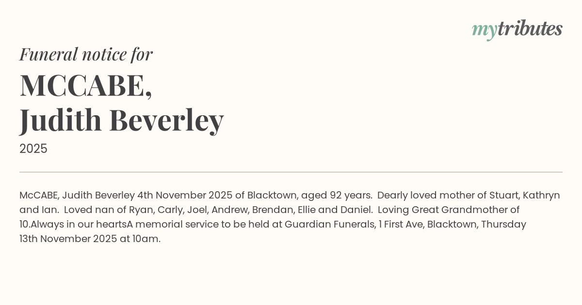 4th November 2025 of Blacktown, aged 92 years. Dearly loved mother of Stuart, Kathryn and Ian. Loved nan of Ryan, Carly, Joel, Andrew, Brendan, Ellie and Daniel. Loving Great Grandmother of 10.