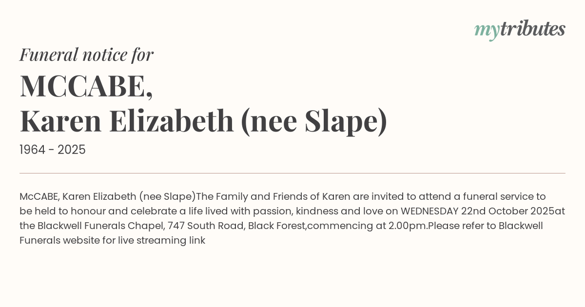 The Family and Friends of Karen are invited to attend a funeral service to be held to honour and celebrate a life lived with passion, kindness and love on