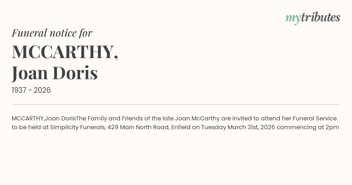 The Family and Friends of the late Joan McCarthy are invited to attend her Funeral Service to be held at Simplicity Funerals, 429 Main North Road, Enfield on Tuesday March 31st, 2026 commencing at 2pm