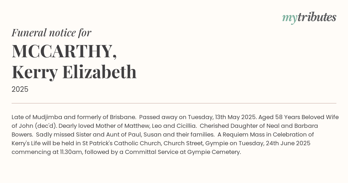 A Requiem Mass in Celebration of Kerry's Life will be held in St Patrick's Catholic Church, Church Street, Gympie on Tuesday, 24th June 2025 commencing at 11.30am, followed by a Committal Service at Gympie Cemetery.