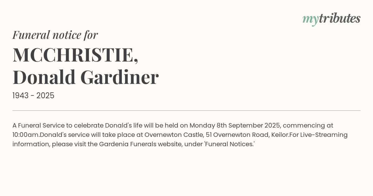 16°CA Funeral Service to celebrate Donald's life will be held on Monday 8th September 2025, commencing at 10:00am.