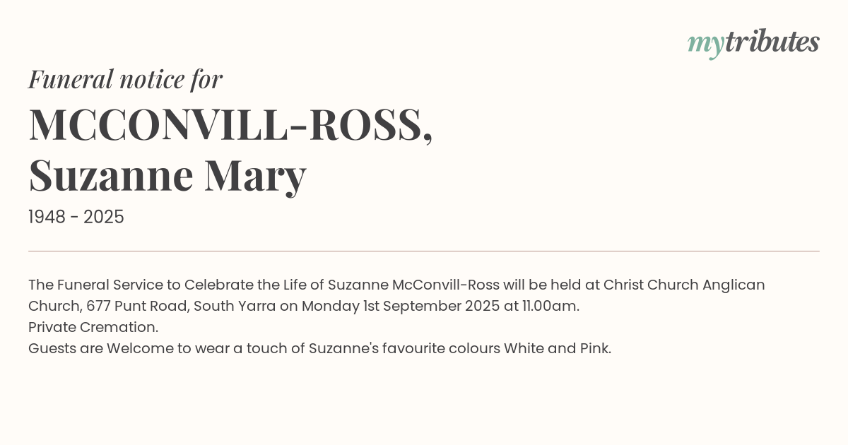 16°CThe Funeral Service to Celebrate the Life of Suzanne McConvill-Ross will be held at Christ Church Anglican Church, 677 Punt Road, South Yarra on Monday 1st September 2025 at 11.00am.