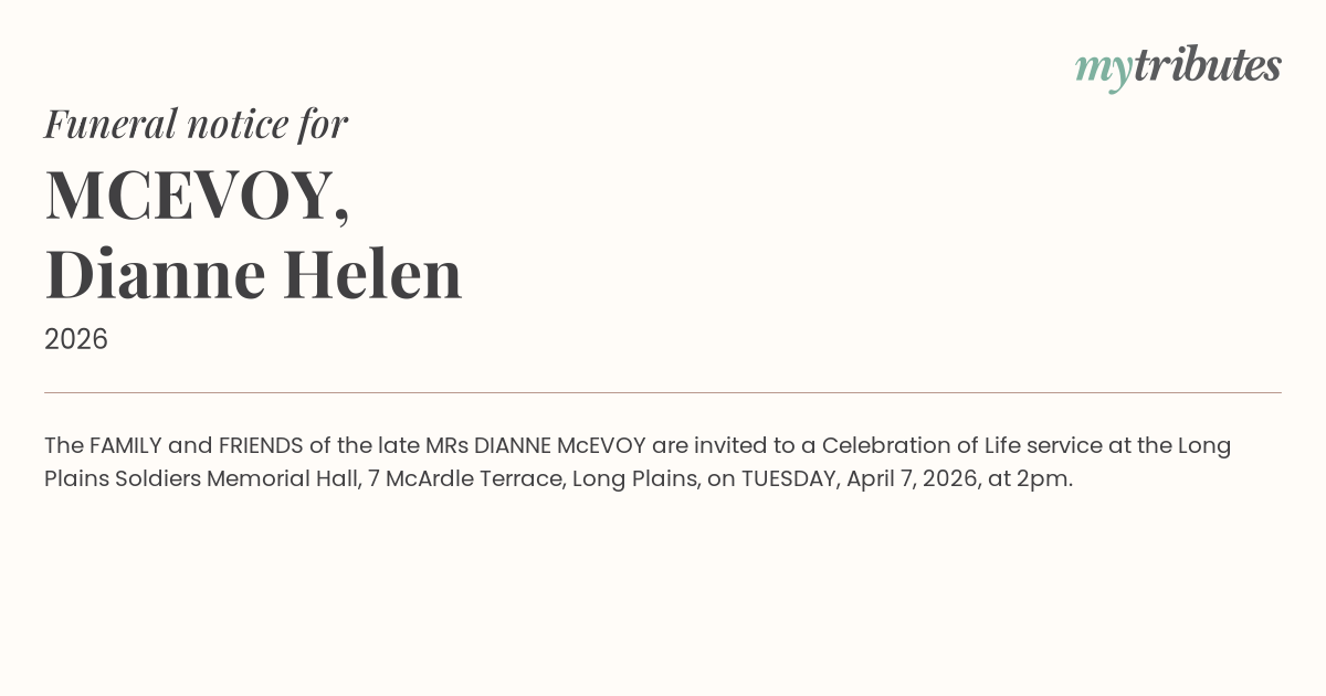 16°CThe FAMILY and FRIENDS of the late MRs DIANNE McEVOY are invited to a Celebration of Life service at the Long Plains Soldier’s Memorial Hall, 7 McArdle Terrace, Long Plains, on TUESDAY, April 7, 2026, at 2pm.
